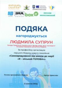 Під час форуму Людмила Павлівна виступила з натхненною промовою про важливість розвитку молодіжного самоврядування, підтримку лідерських ініціатив серед молоді та налагодження партнерства між освітою, владою й громадськістю.